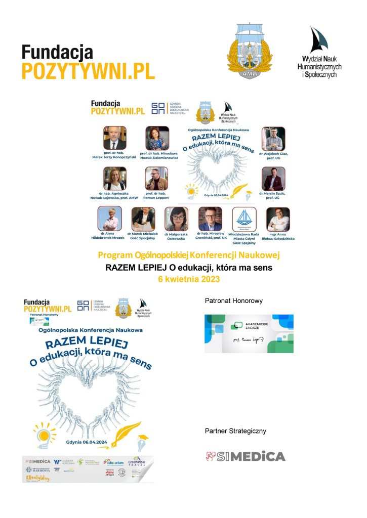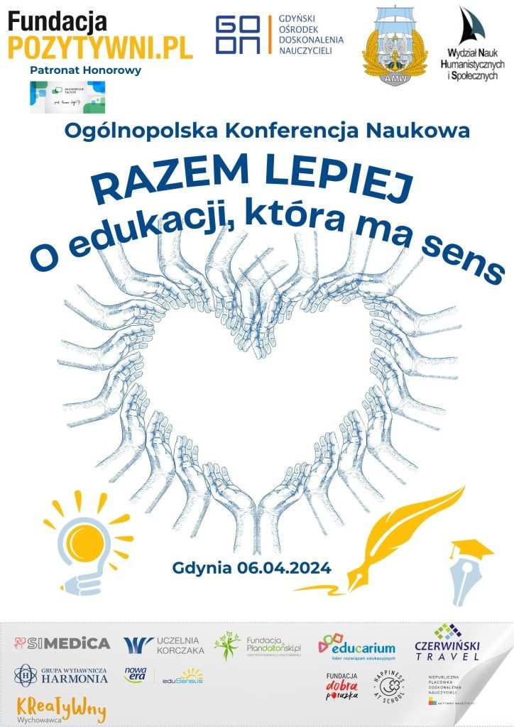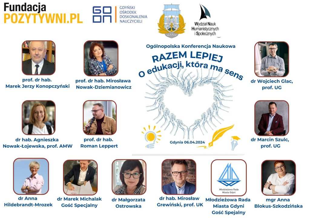 Fundacja Pozytywni wraz z Gdyńskim Ośrodkiem Doskonalenia Nauczycieli i Akademią Marynarki Wojennej w Gdyni zapraszają na Ogólnopolską Konferencję Naukową „RAZEM LEPIEJ O edukacji, która ma sens„, która odbędzie się 6 kwietnia 2024 w Gdyni (Biblioteka Akademii Marynarki Wojennej Audytorium) w formule stacjonarnej oraz online (bezpośrednia transmisja do pokoju konferencyjnego).