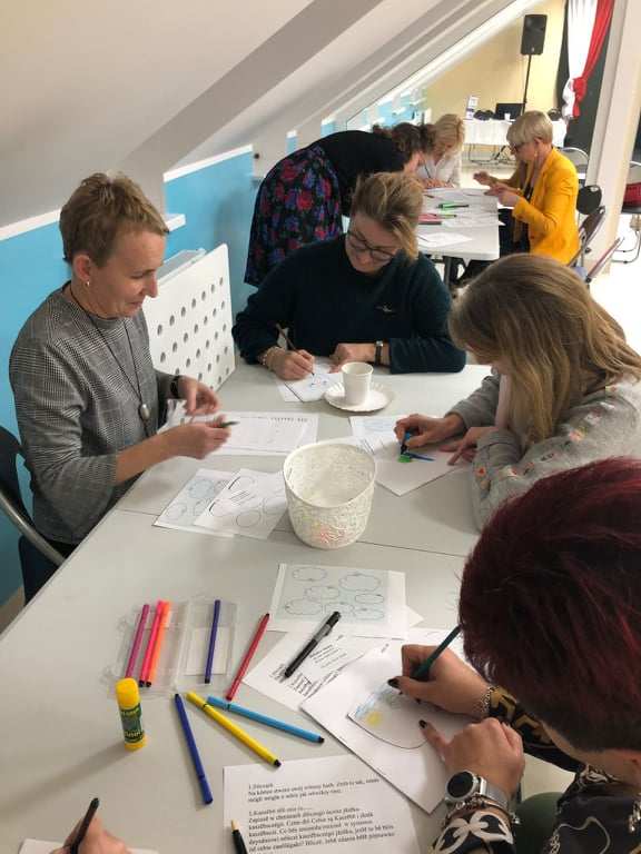 Podczas spotkania nauczyciele mieli okazję wykonać kilka specjalnie przygotowanych na tę okazję zadań, a następnie pracując w grupach porównać swoje projekty. Ćwiczenia miały na celu nie tylko wywołać skupienie uczestników na ich realizacji, a tym samym na zastanowieniu się nad swoimi mocnymi i słabymi stronami oraz zainteresowaniami, ale również zintegrować grupę.