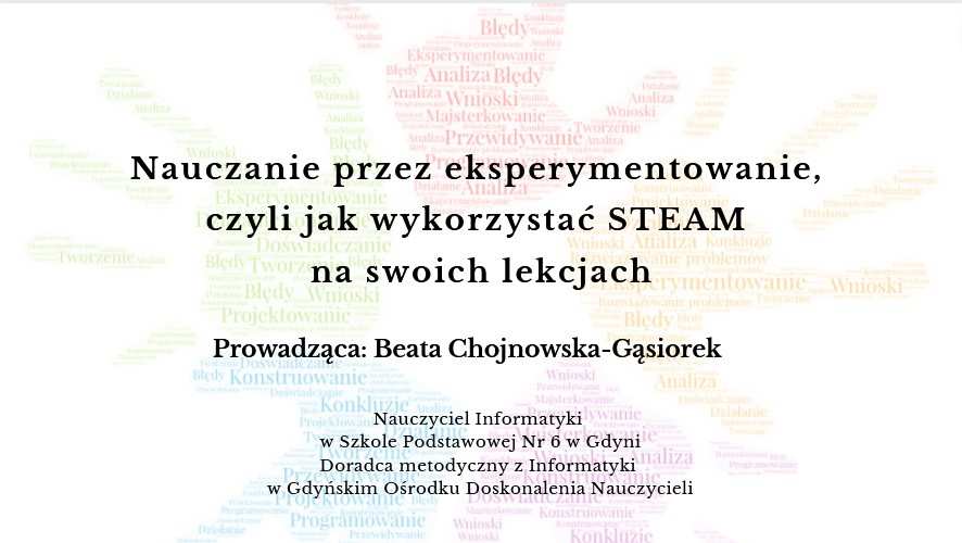 8 grudnia 2022r odbędzie się fantastyczne szkolenie w Centrum Nauki Experyment, na które zapraszamy wszystkie nauczycielki i nauczycieli województwa pomorskiego. To kolejne szkolenie w ramach cyklu WARTO SIĘ SZKOLIĆ, które odbędzie się w Centrum Nauki Experyment. Tematem najbliższego spotkania będzie „Nauczanie przez eksperymentowanie, czyli jak wykorzystać STEAM na swoich lekcjach„, które przeprowadzi nasz doradca metodyczny z informatyki Beata Chojnowska-Gąsiorek.